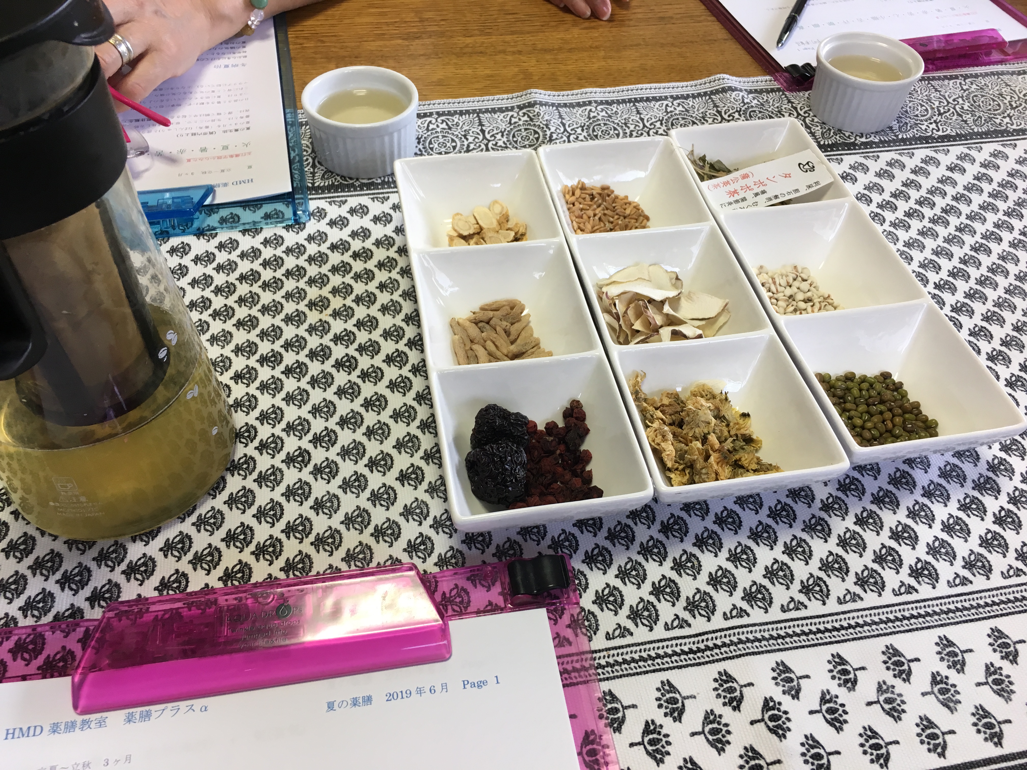 今月の薬膳教室の座学では、五行「火」に属する「心」「小腸」、そして「陽気」の扱い方と熱中症対策を学びました。座学の後はお待ちかねの、先生お手製夏の薬膳ランチをいただきました。