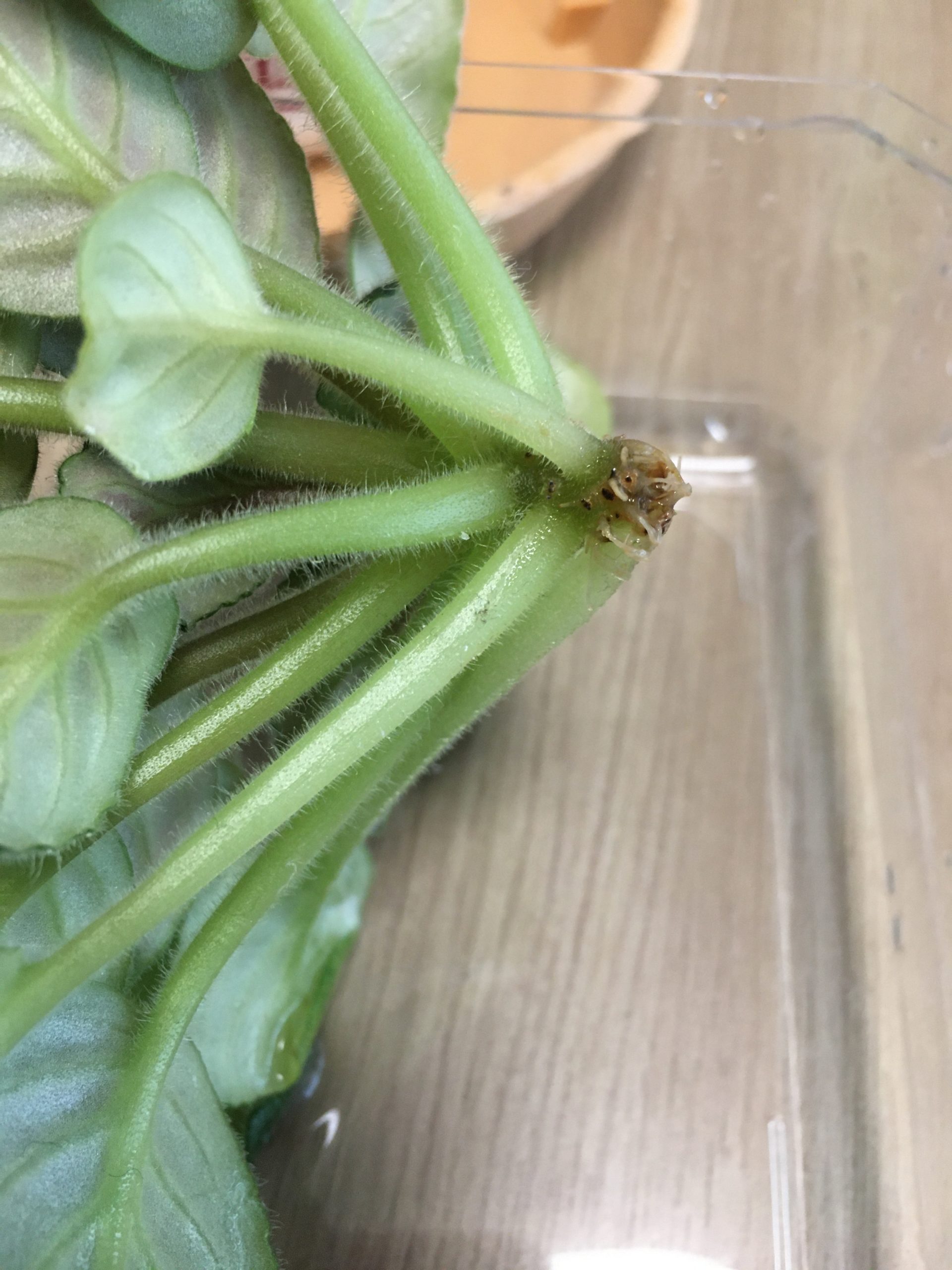子株を触っていたら、ポロっと株ごと取れてしまったためしばらく水につけておきました。しばらくして、株の茎だったところから根が出てきました。根が出てくれば土に植えることができますので、鉢増し(植え替え)をすることにしました。