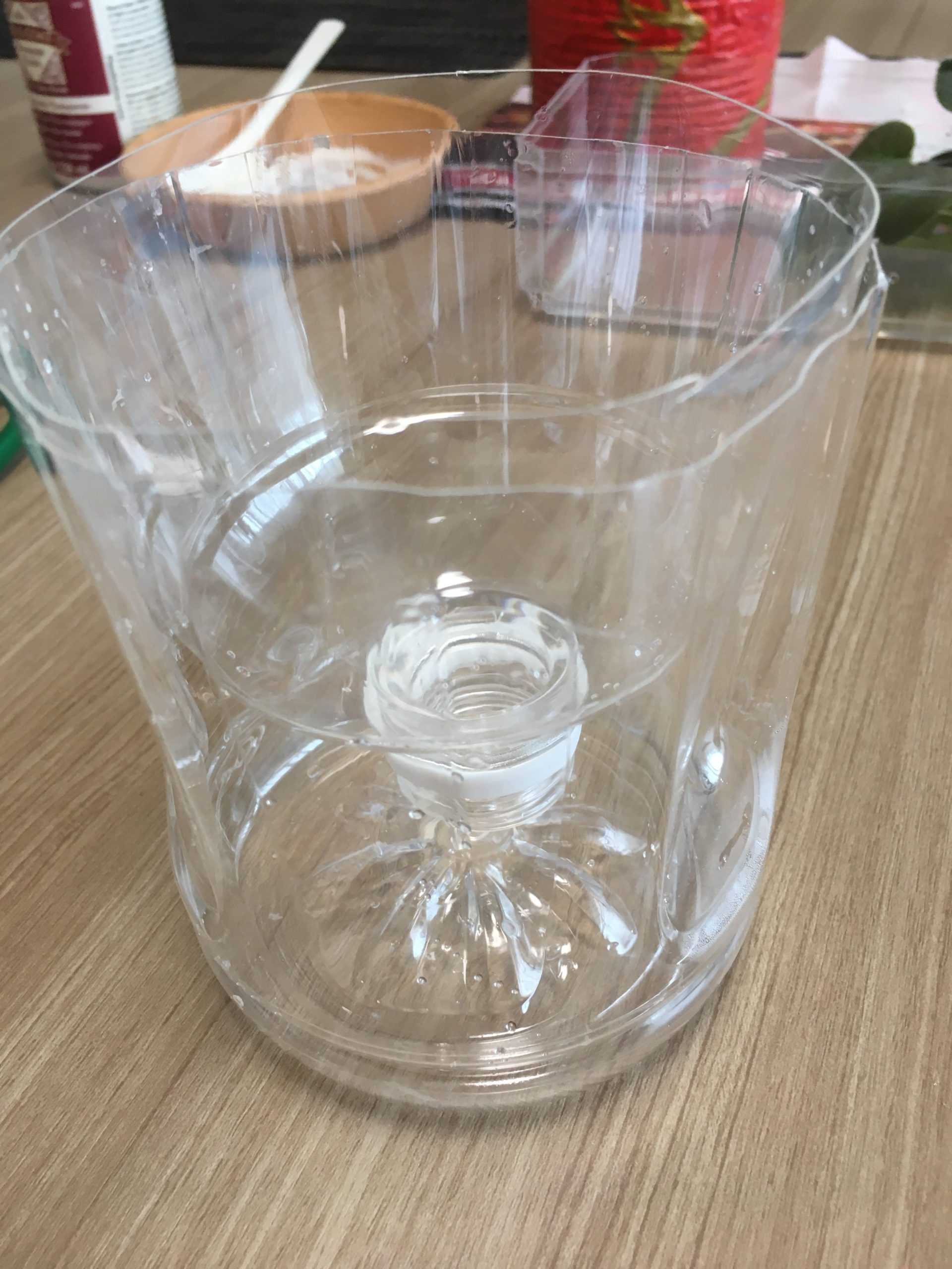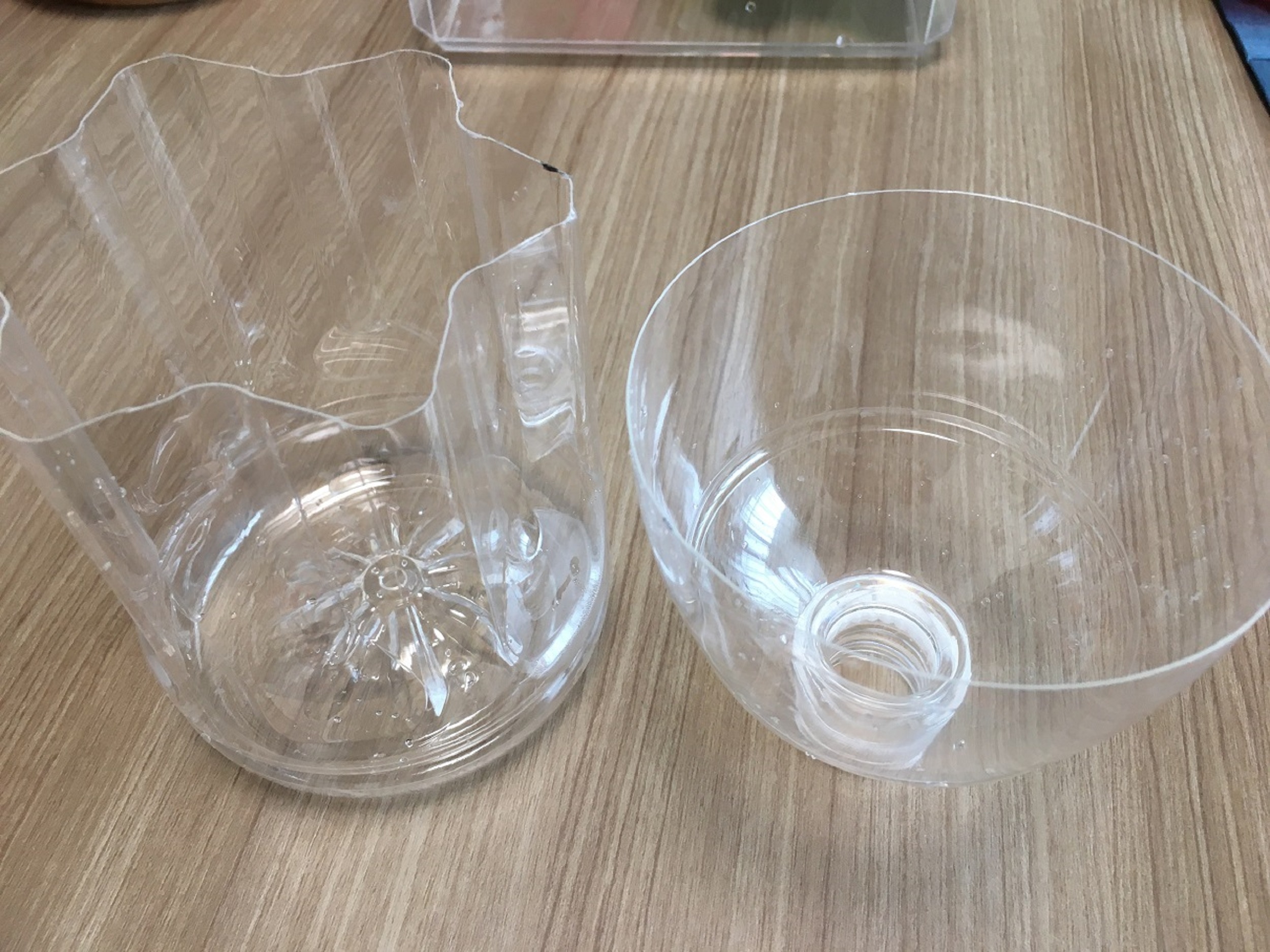 1.ペットボトルを、鉢カバーより1cmほど低い高さに切ります。(A)