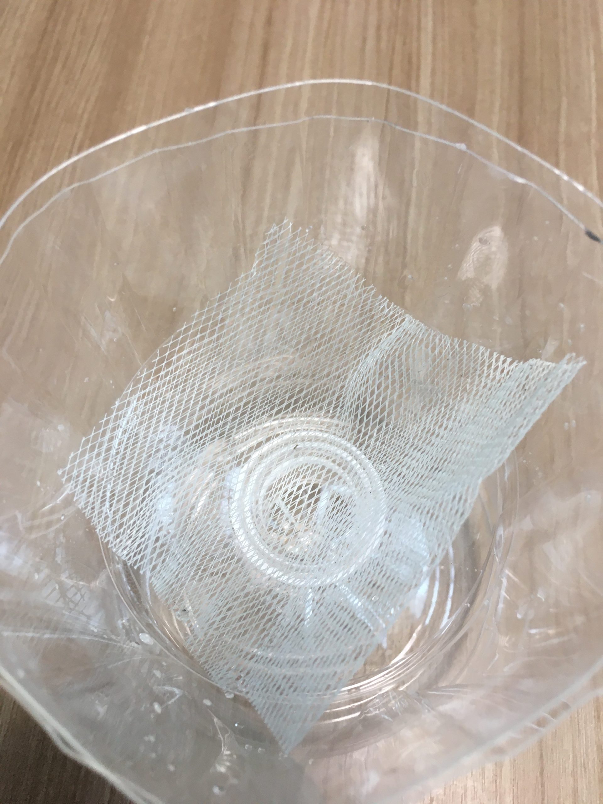 3.排水溝ネットを逆さにしたペットボトルの口部分に敷きます。(土が落ちないようにするため)