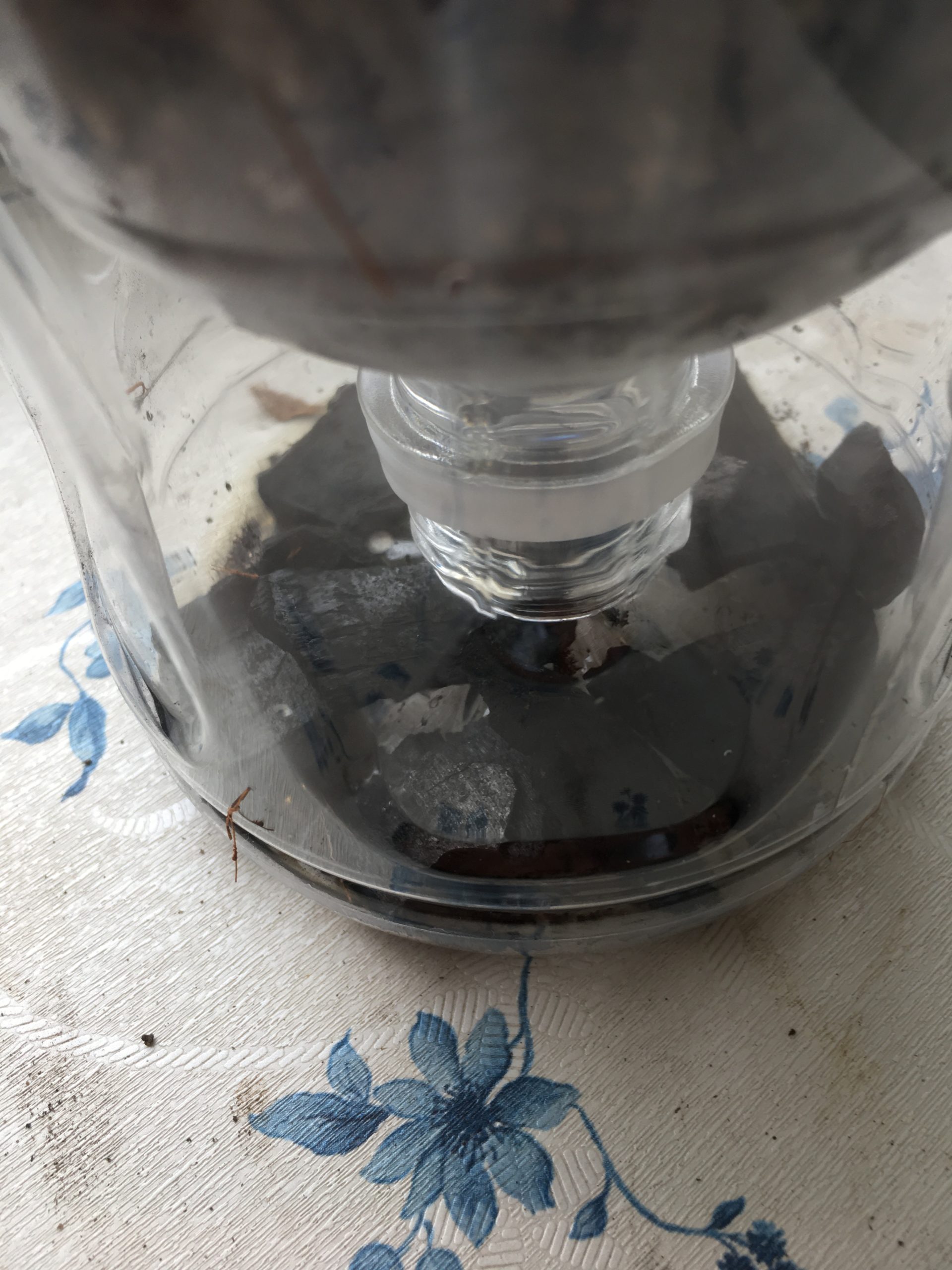 4.深いほうの容器に炭を入れます。次に、浅い口がある方の器に土を入れます。炭を敷くことで、底に余分な水が下に落ちても、水が腐りづらくなります。